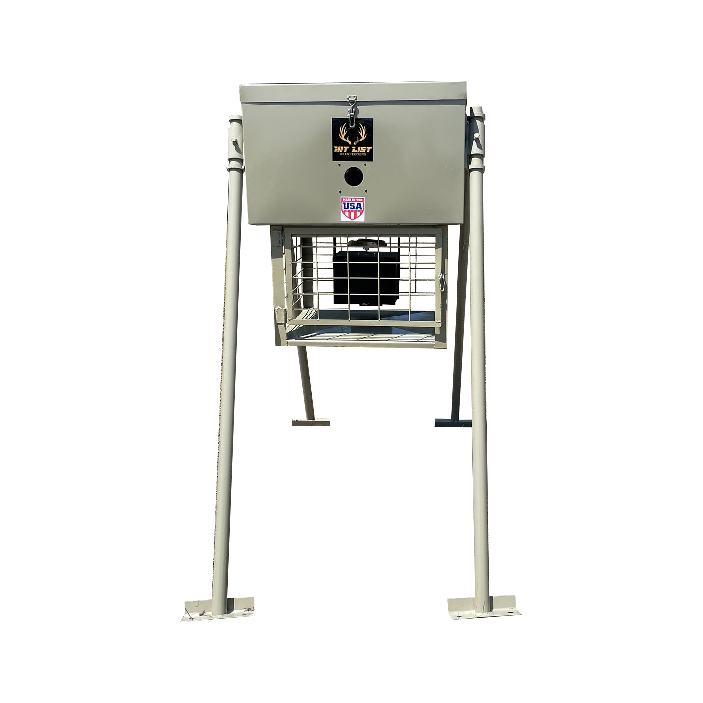 The innovative design of the legs and cage is tailored to thwart unwanted varmint intrusion, safeguarding the broadcast mechanism and your precious feed. The legs seamlessly insert into 2x2 square tubing, providing reinforced strength and stability, while also allowing for easy customization of heights to suit your specific needs.